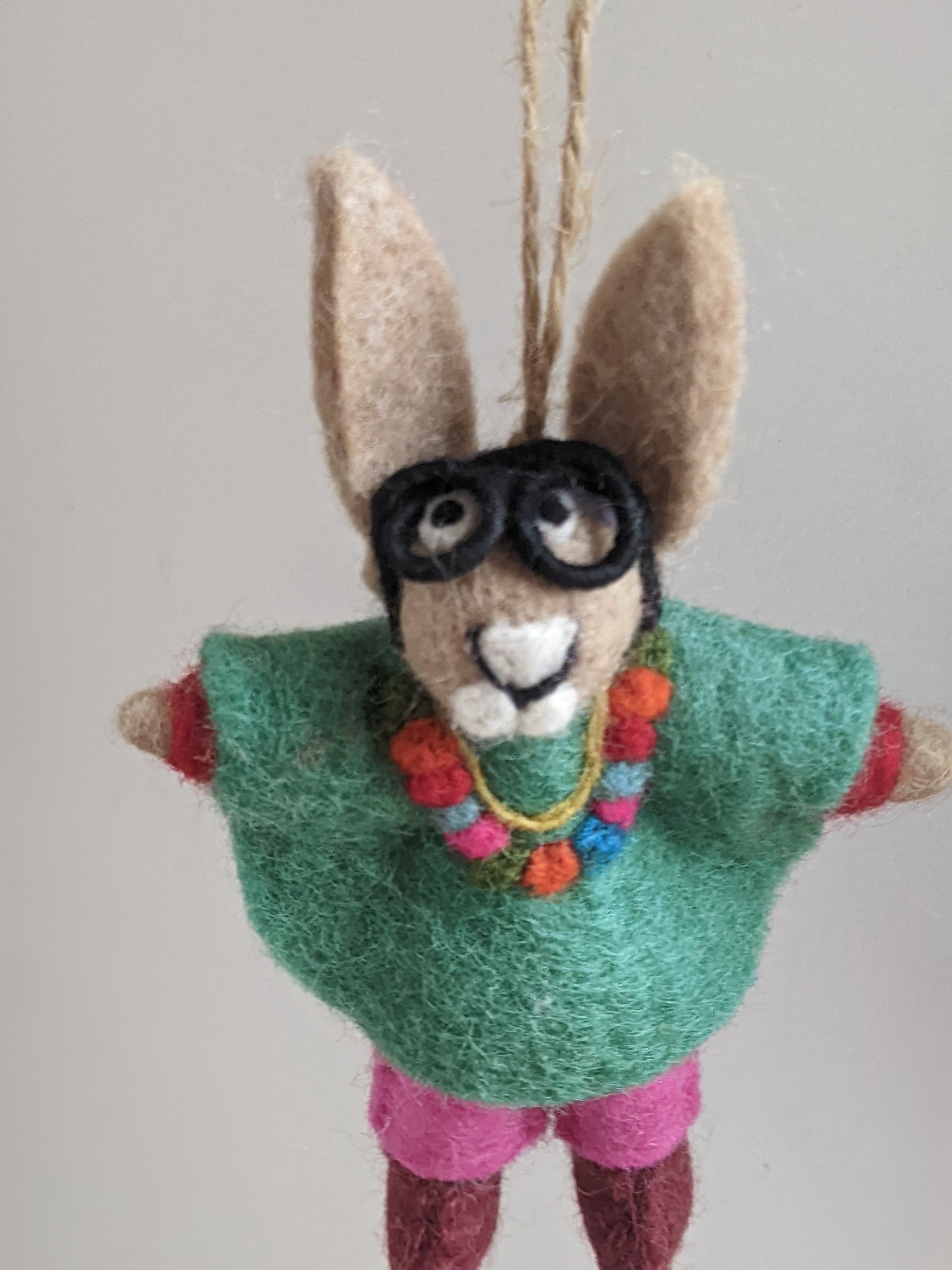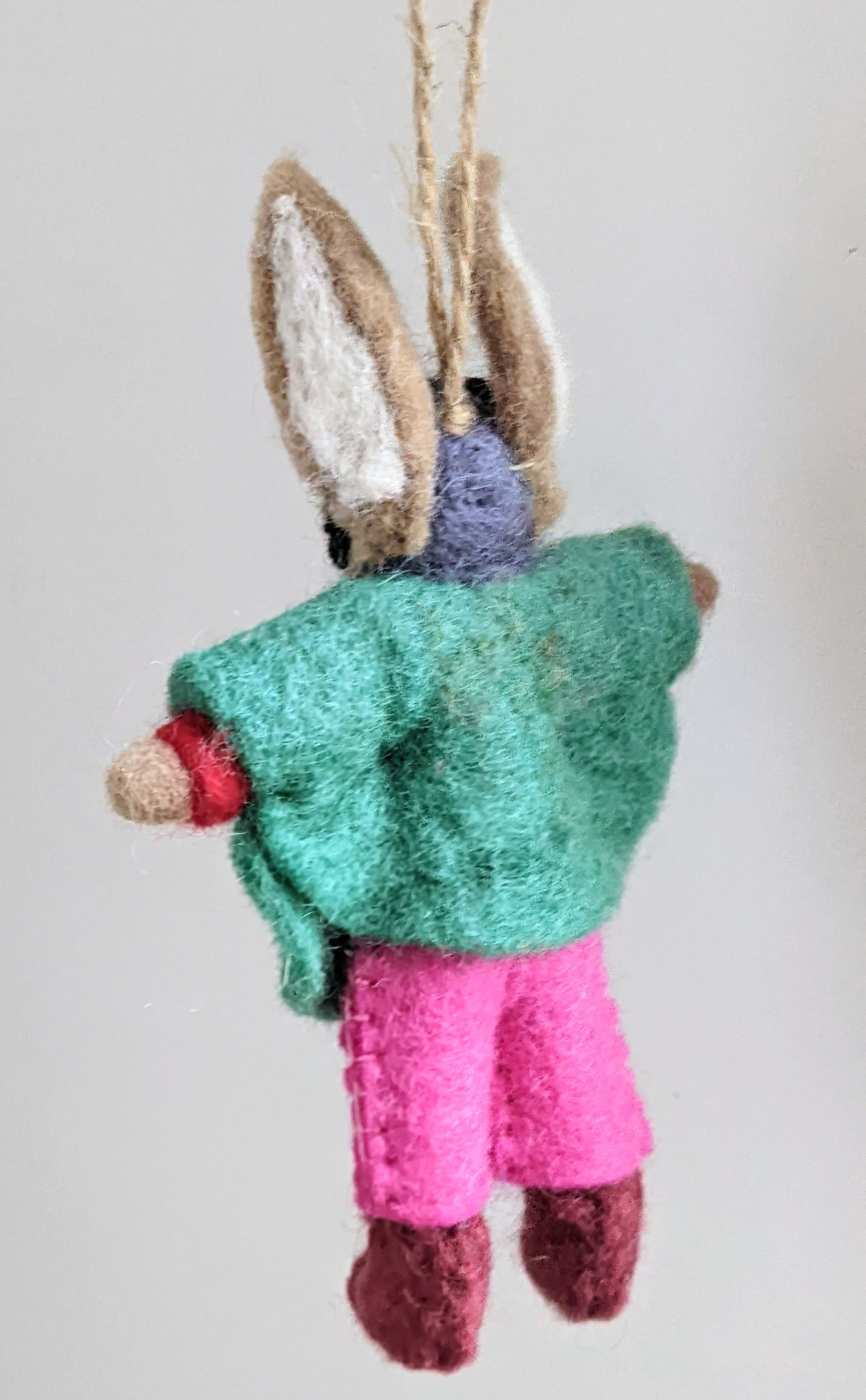 "Unleash your inner fashionista with this handmade felted bunny decoration! Complete with a chic poncho and necklace, this fair trade and biodegradable bunny is perfect for adding a touch of style to your handbag, backpack, or Christmas tree. Who said eco-friendly couldn't be fashionable?!"