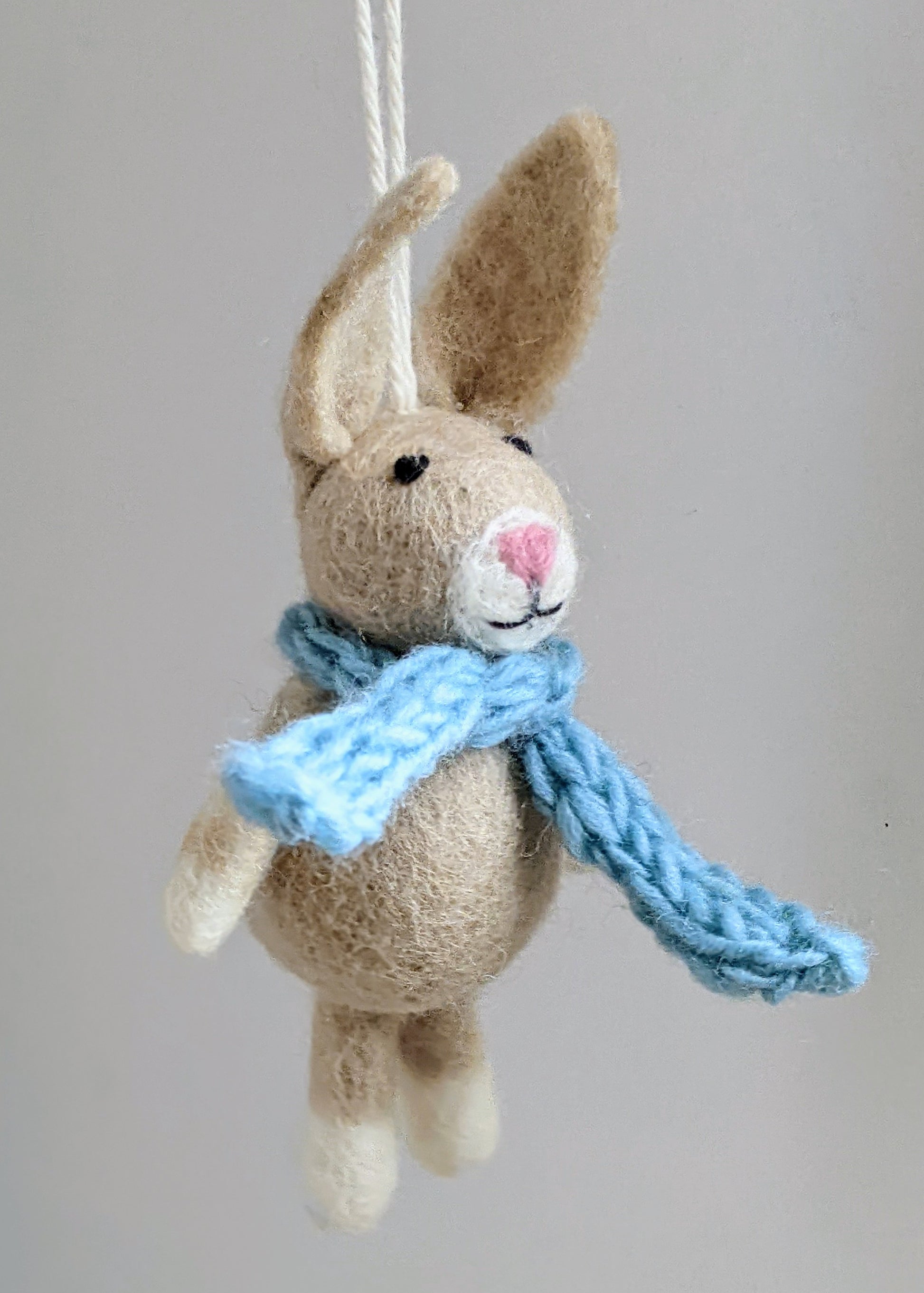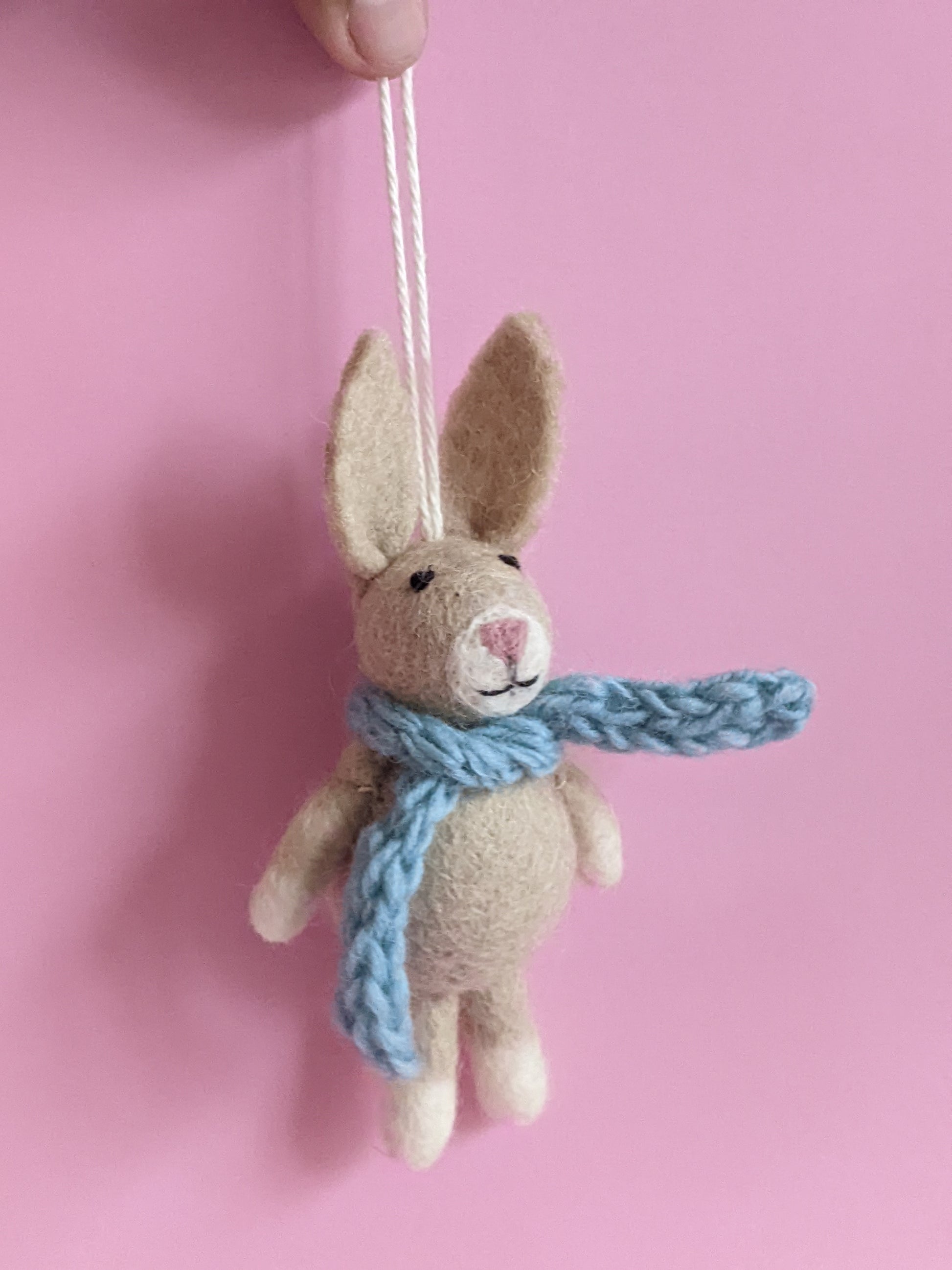 "Add some whimsy to your life with Flopsy the Bunny! This handmade felted bunny comes with a charming knitted blue scarf and can be used as a keychain, backpack decoration, or even as a festive Christmas ornament. Hop to it and get yours today!"
