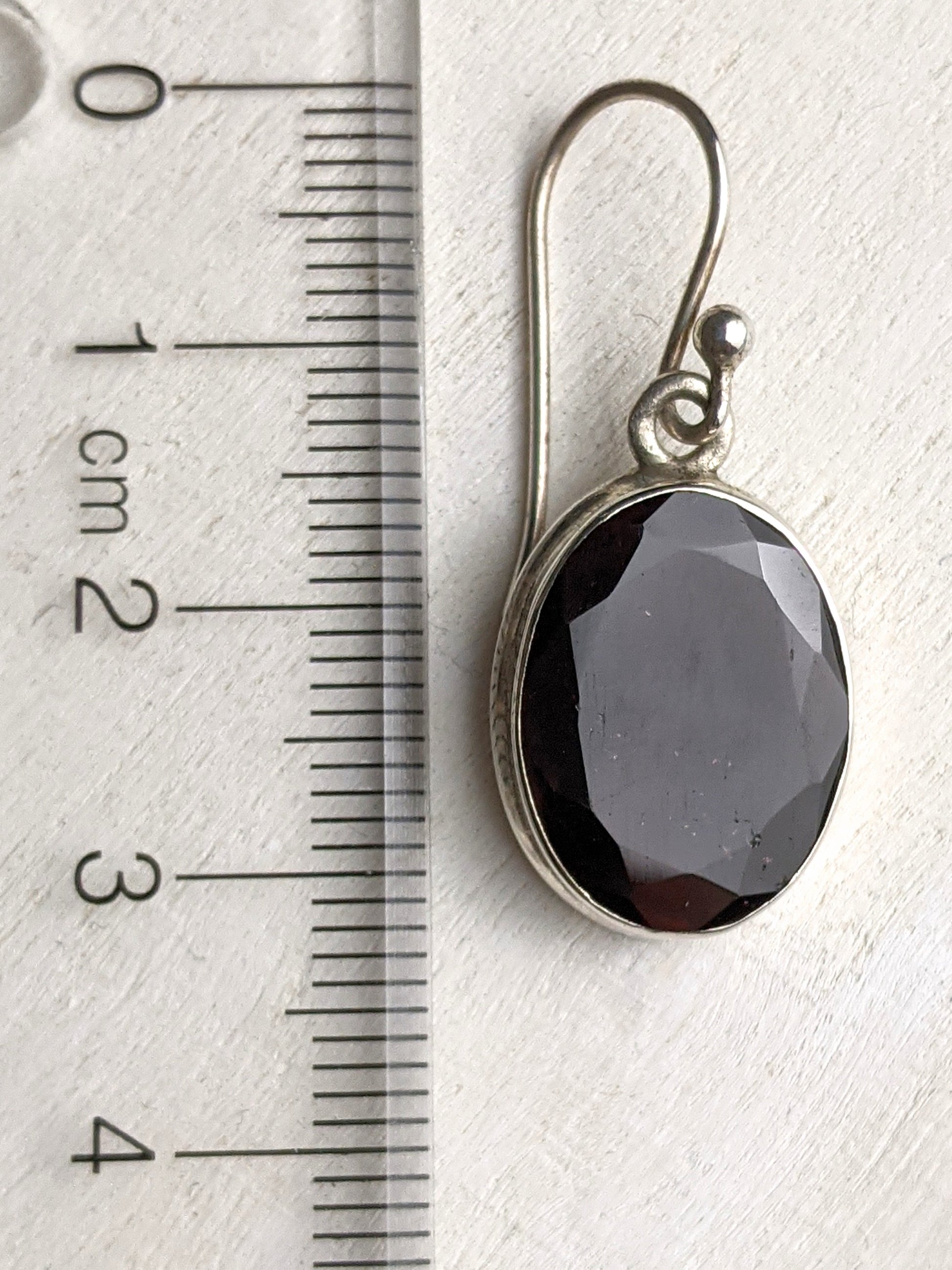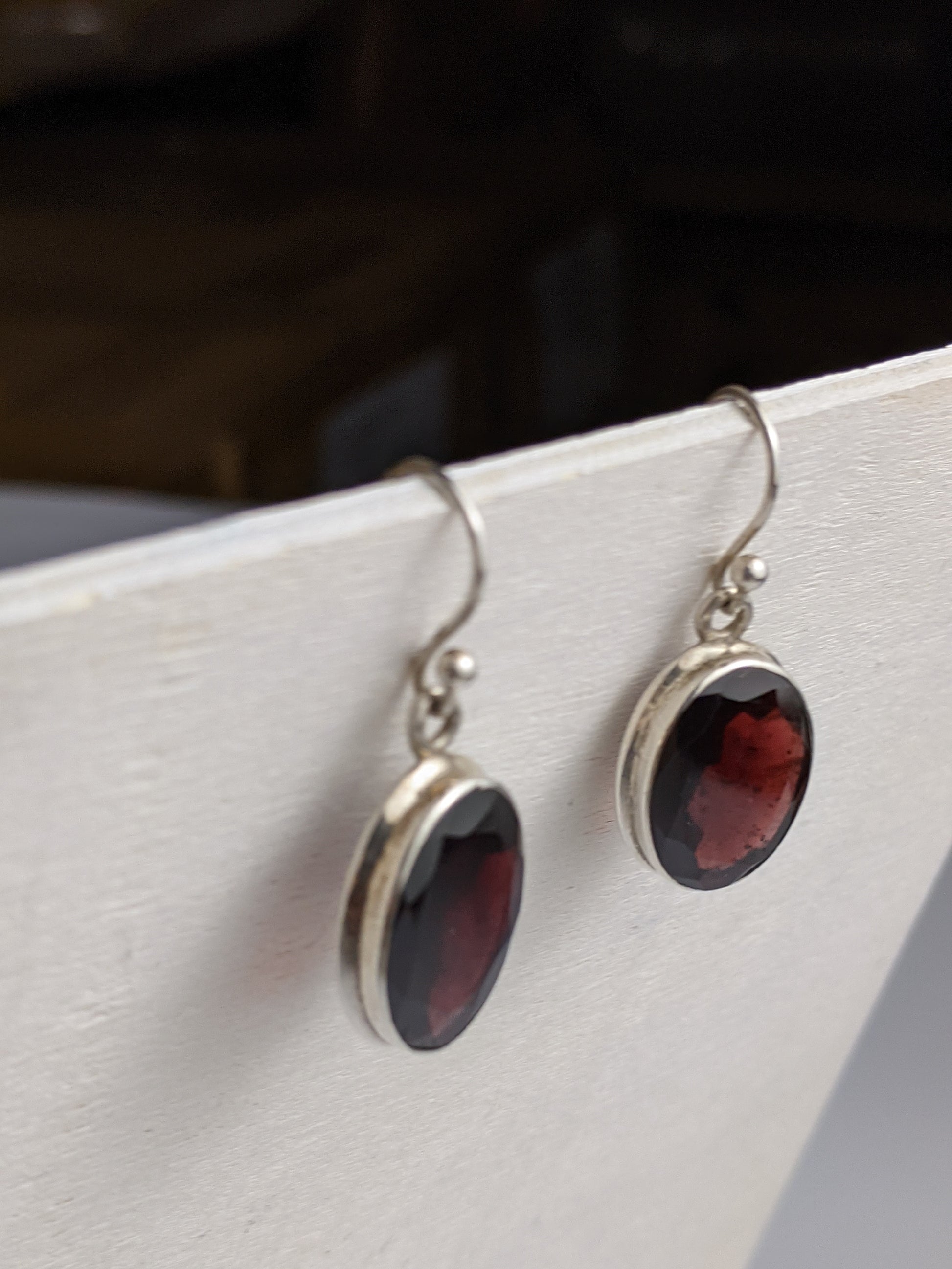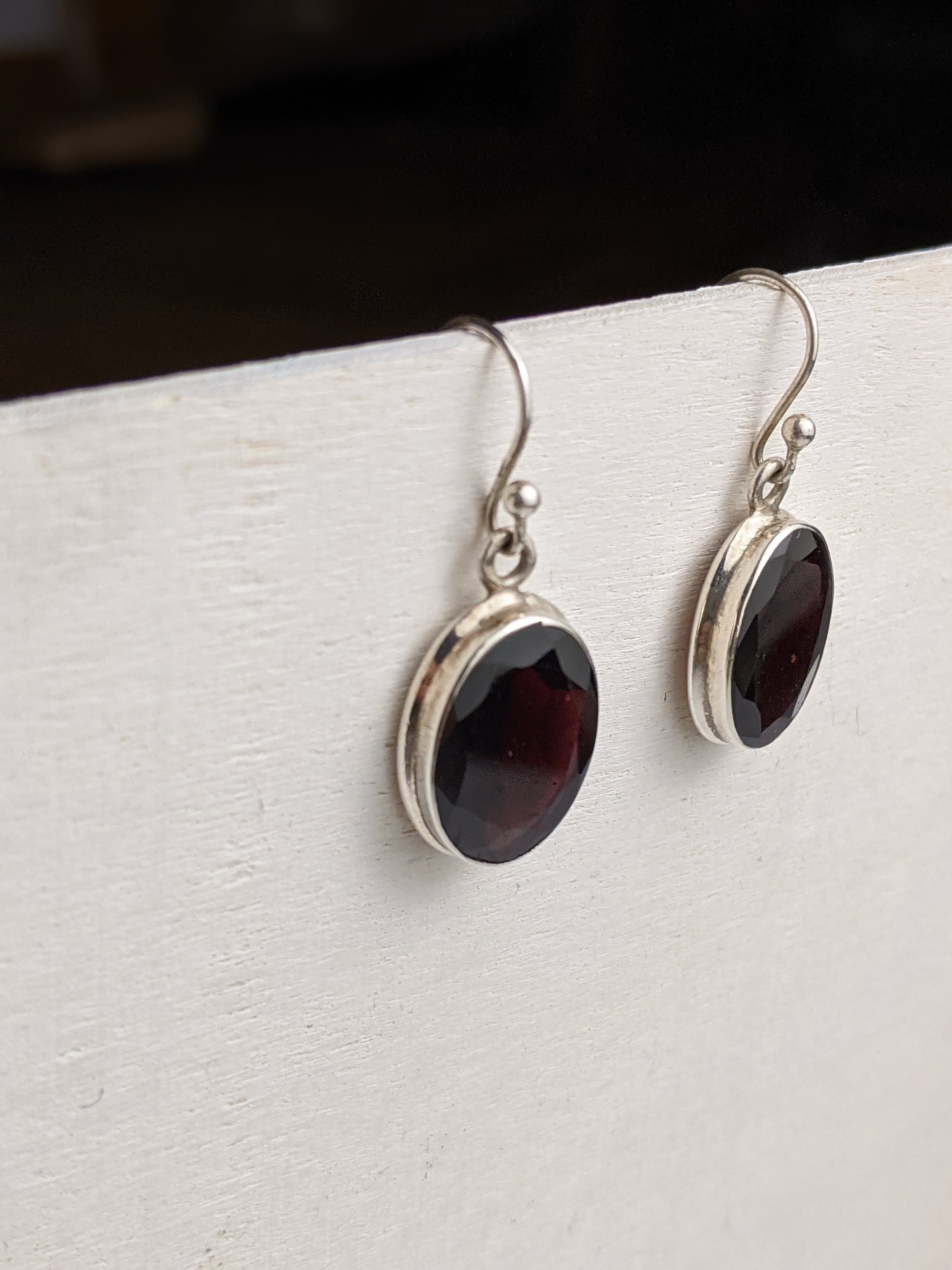 A classic Oval Drop earring with a faceted deep Garnet red set in sterling silver.