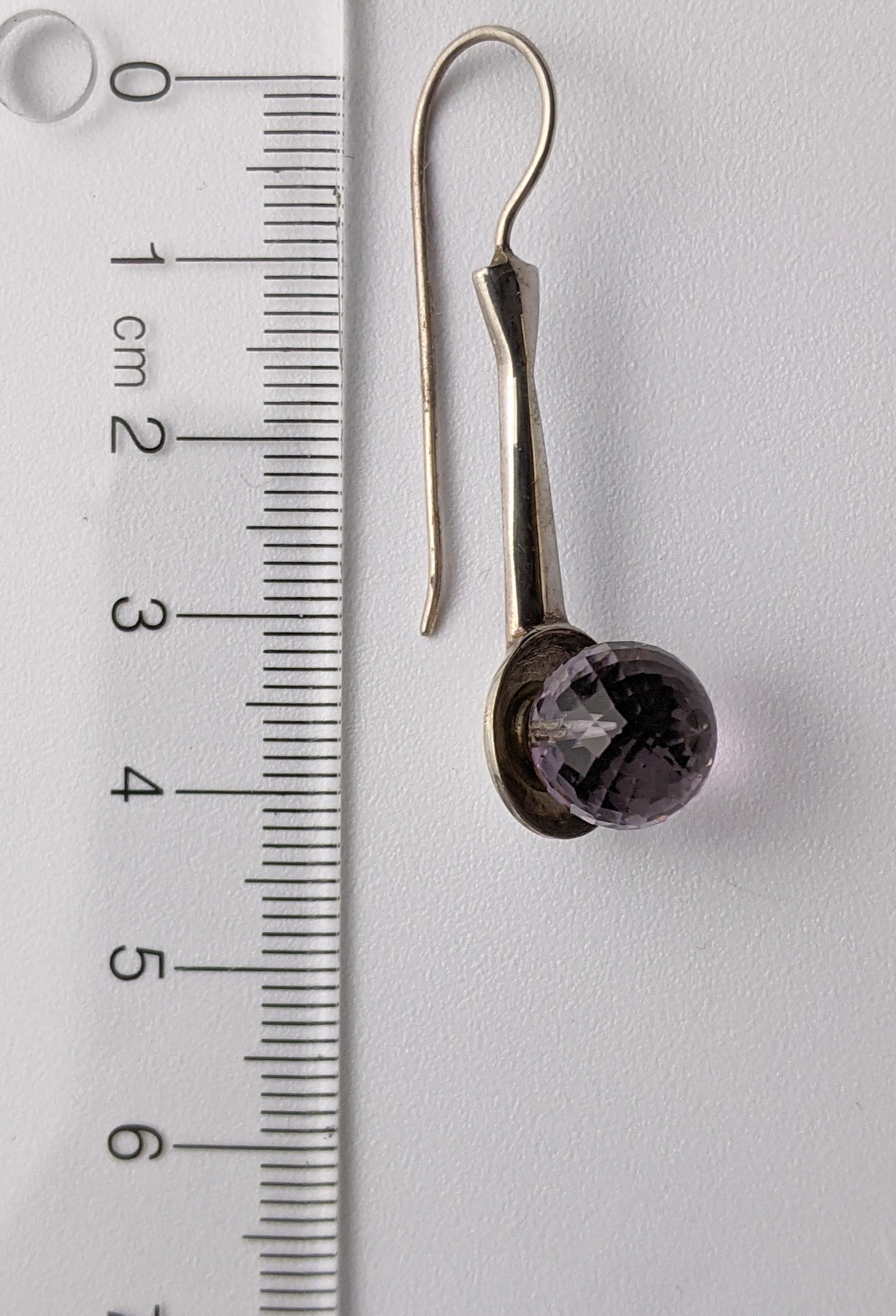 A solid silver drop earring with a perfect faceted circle Amethyst.