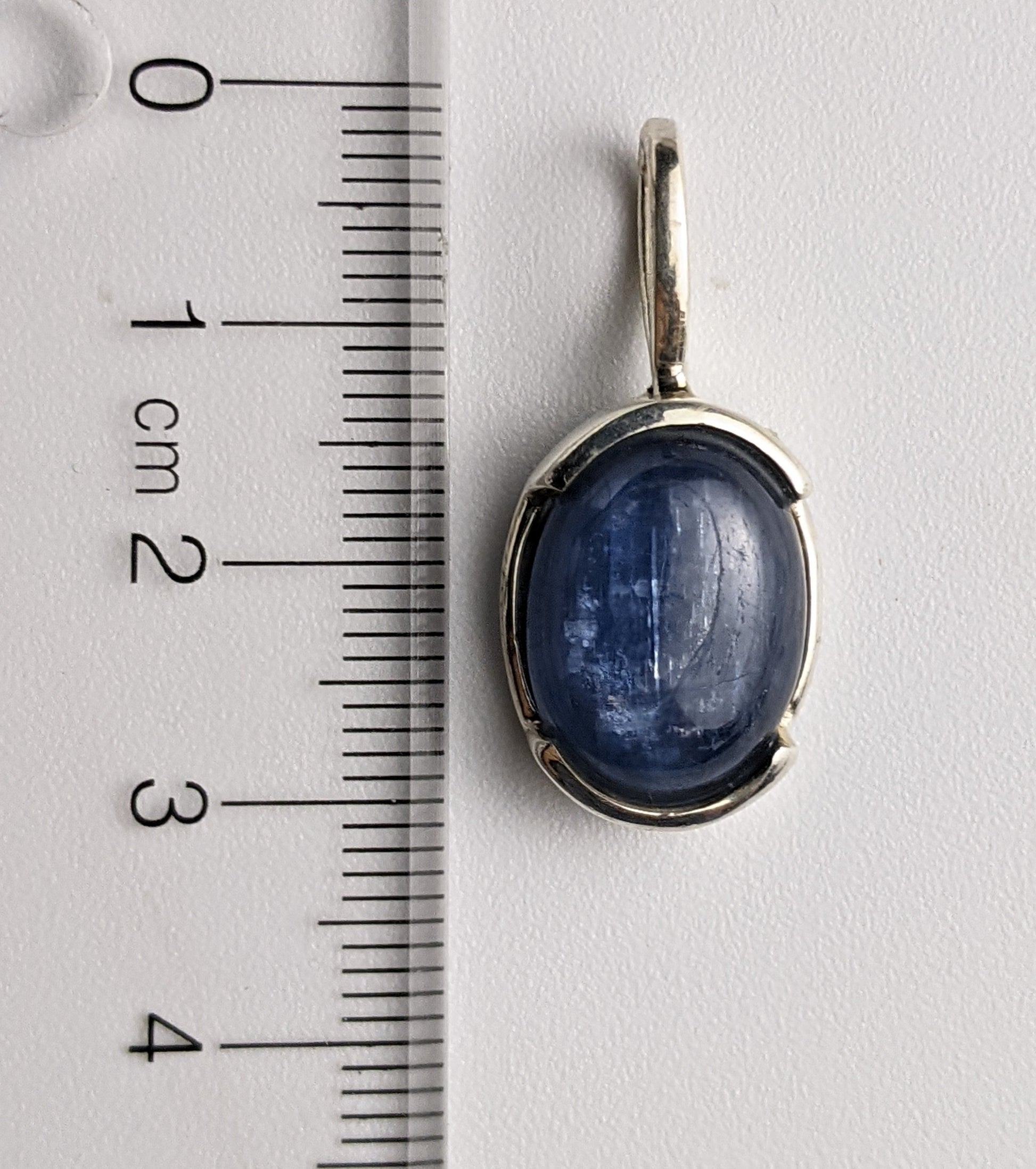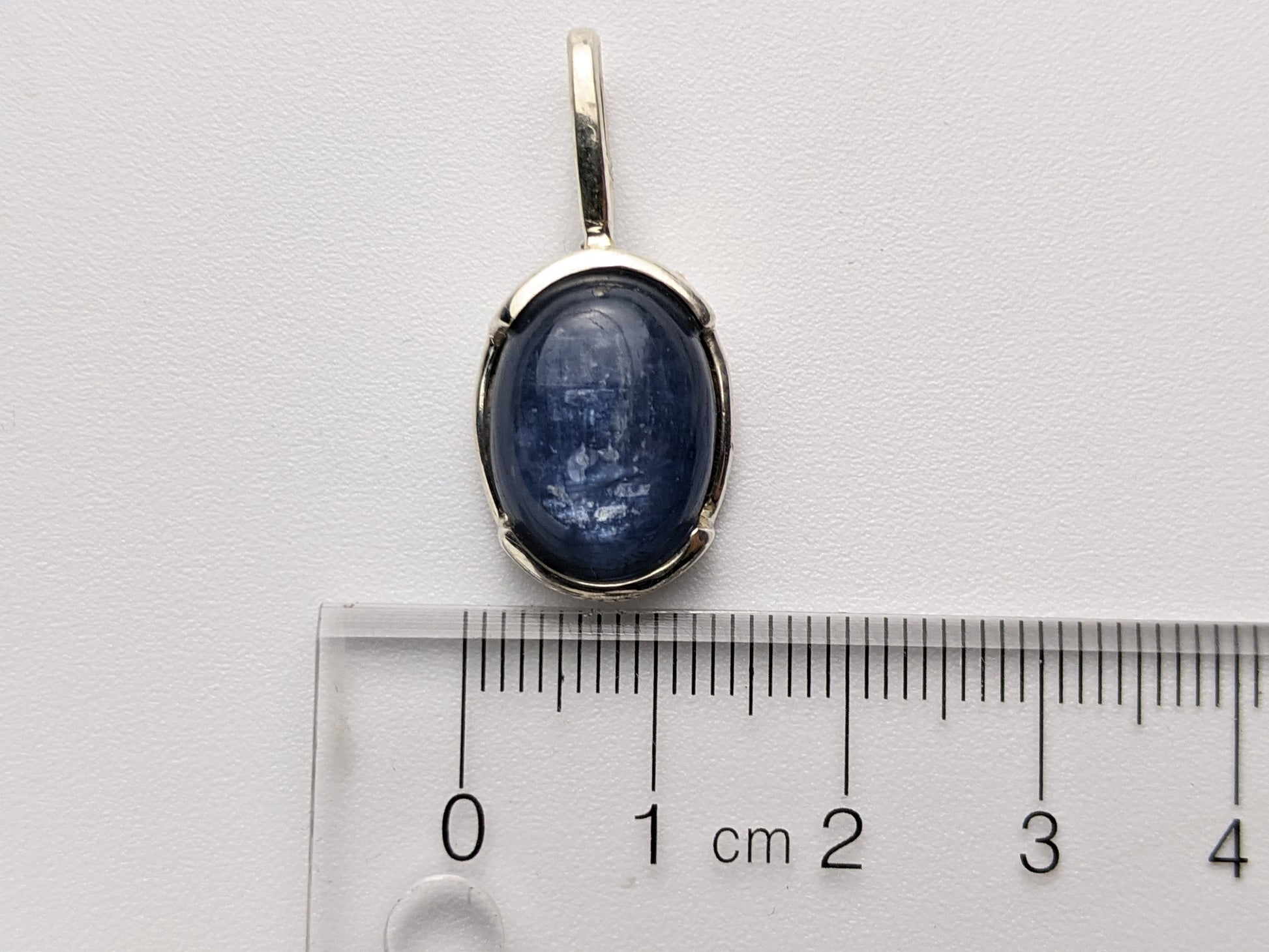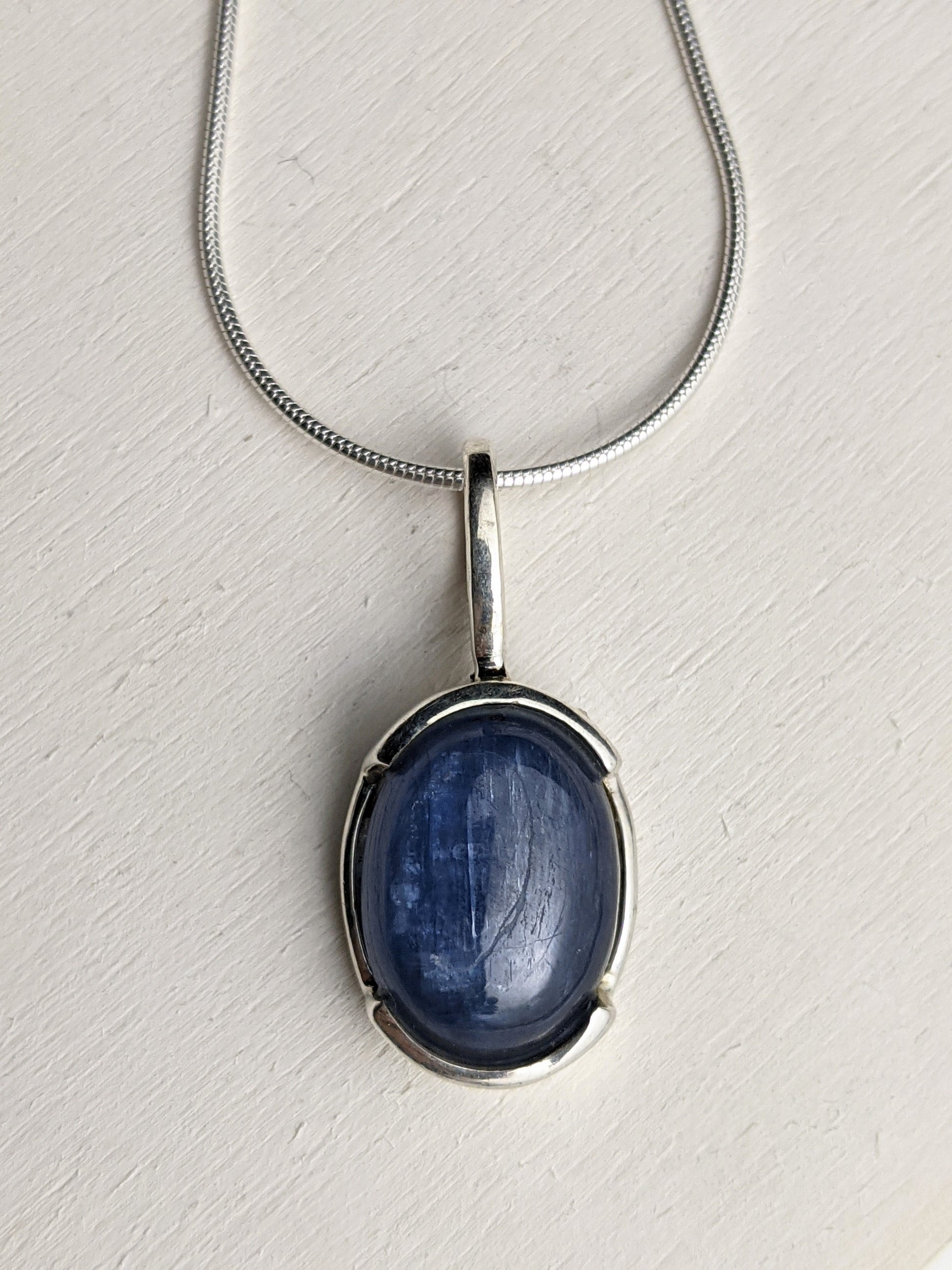 An elegant oval shaped polished Kyanite set in Sterling Silver with a generous loop, perfect for an assortment of chains.