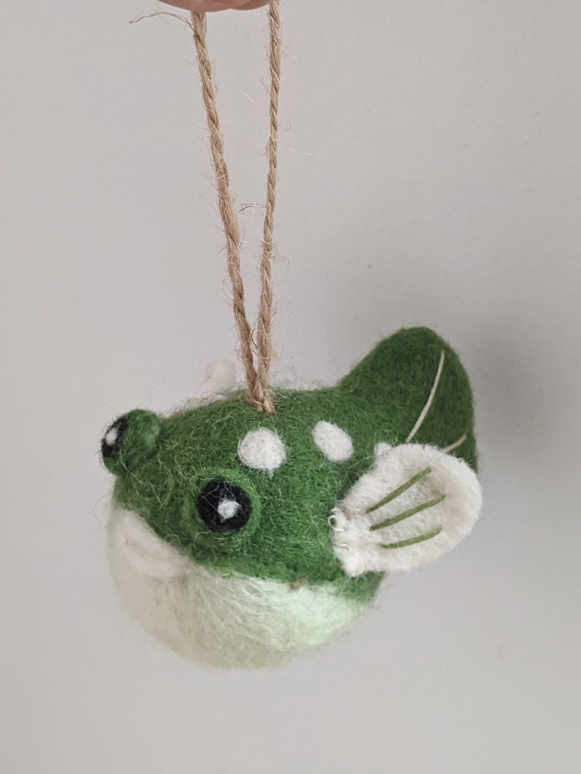 Introducing your new favorite accessory: the adorable green and white felted puffer fish! Perfect for jazzing up your keychain, backpack, or Christmas tree. Handmade with love, this cute fish is a must-have for any ocean lover!
