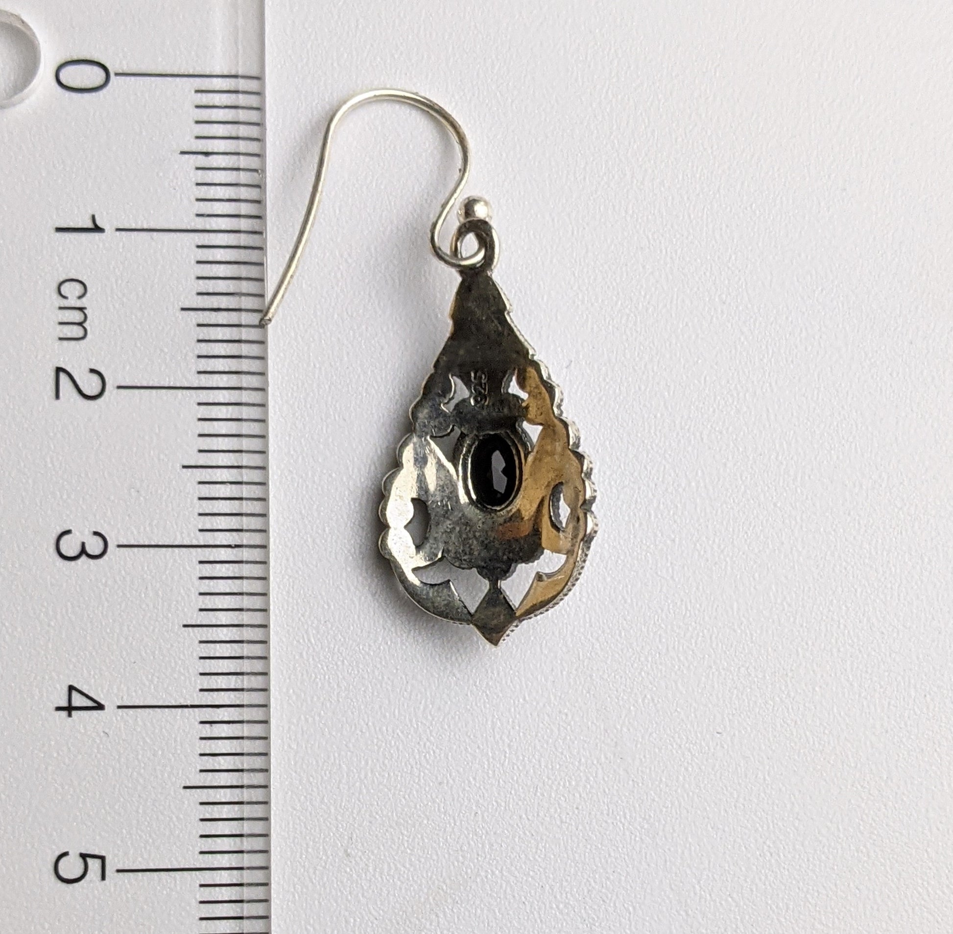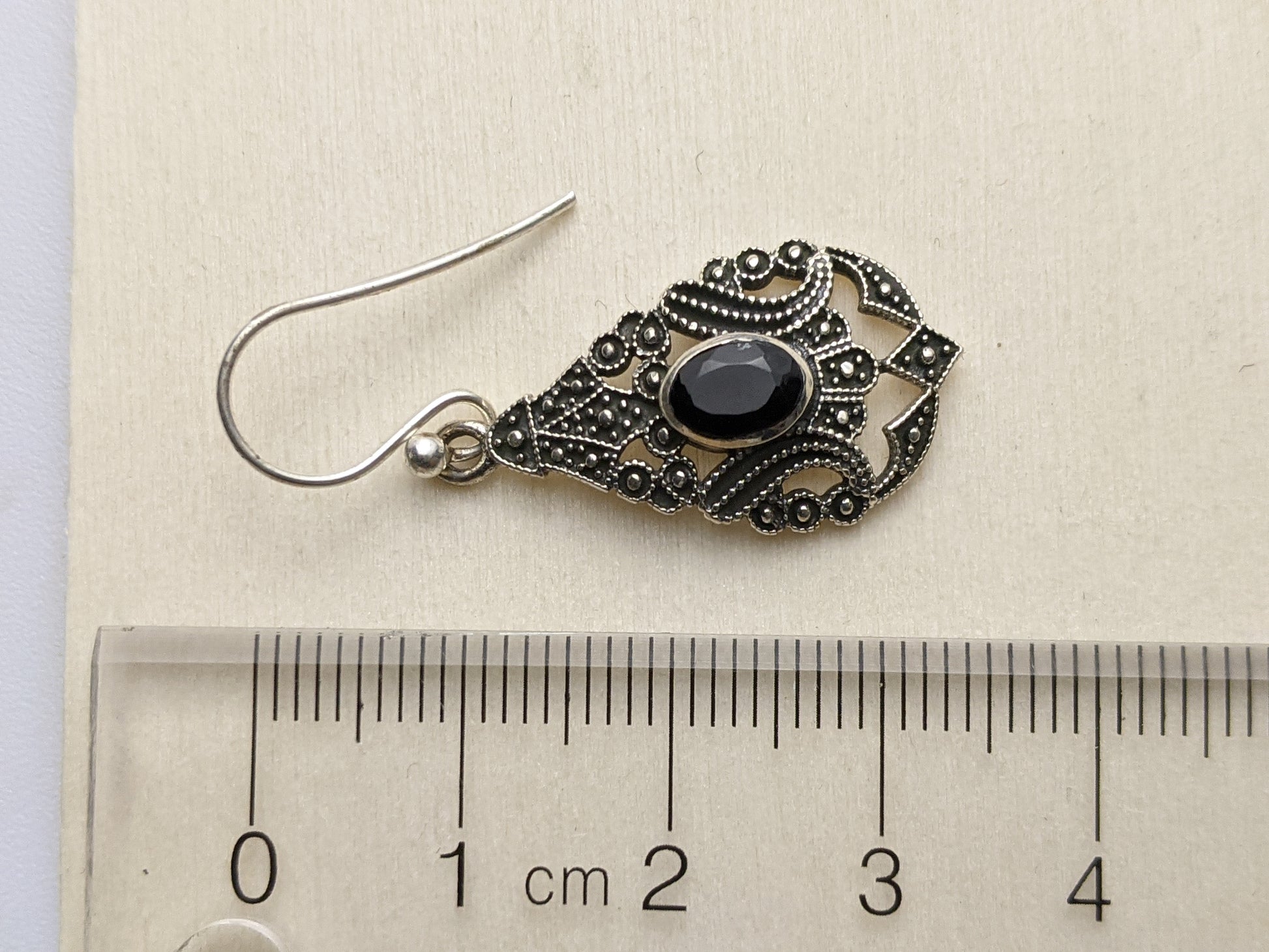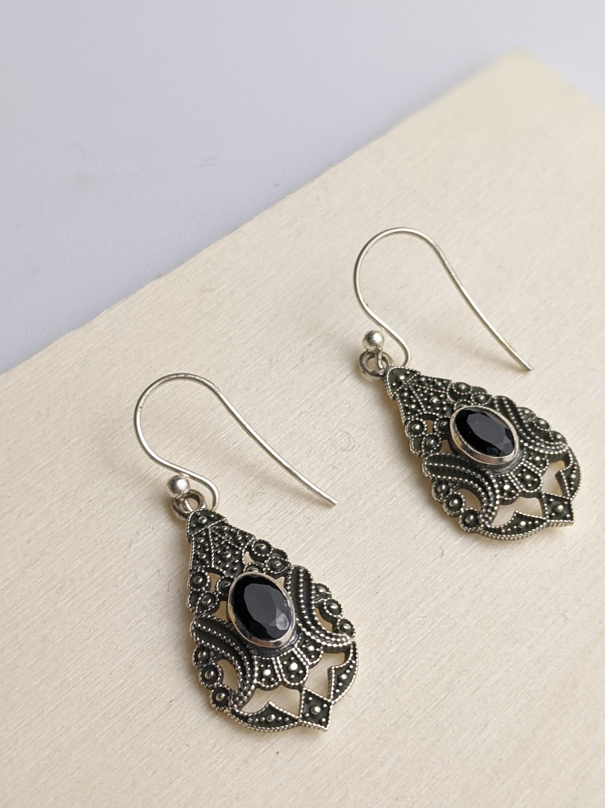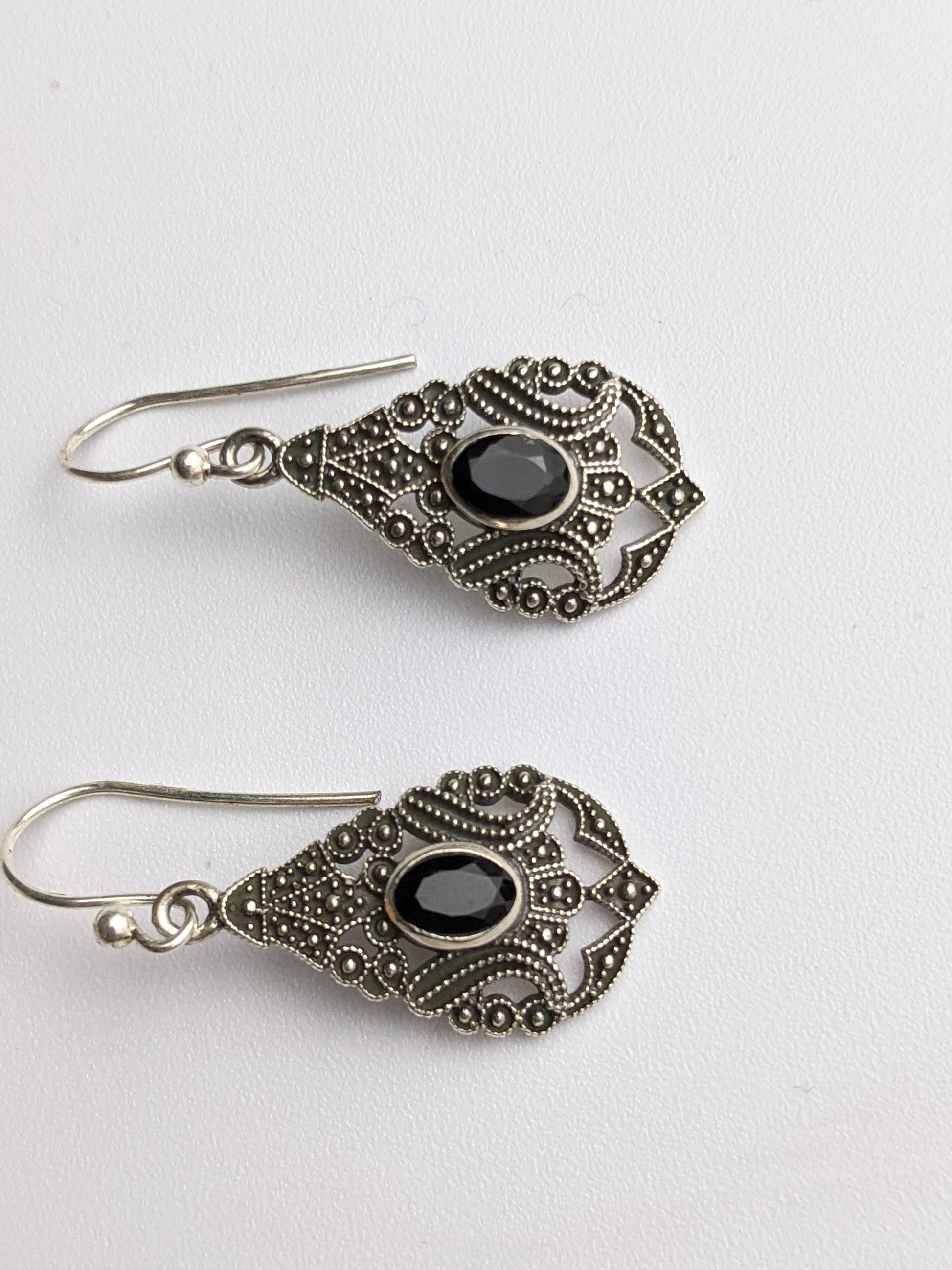 A lovely detailed filigree silver earrings, with a oval faceted onyx.