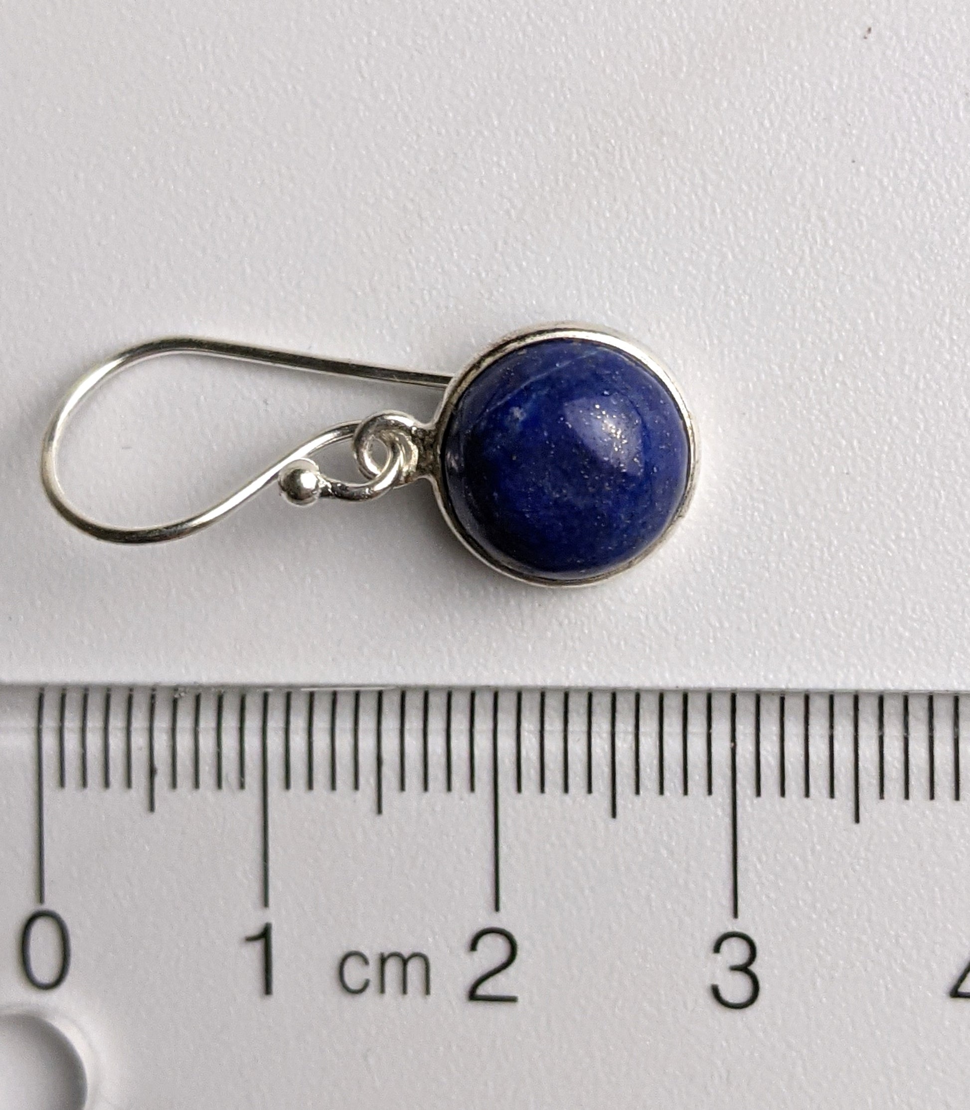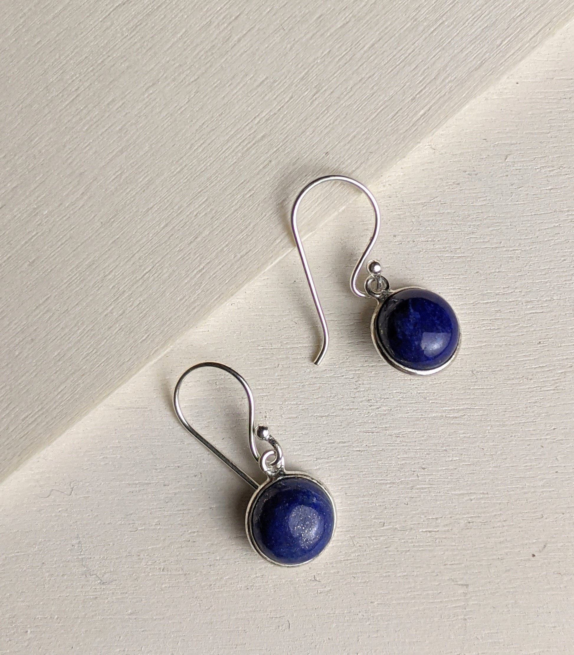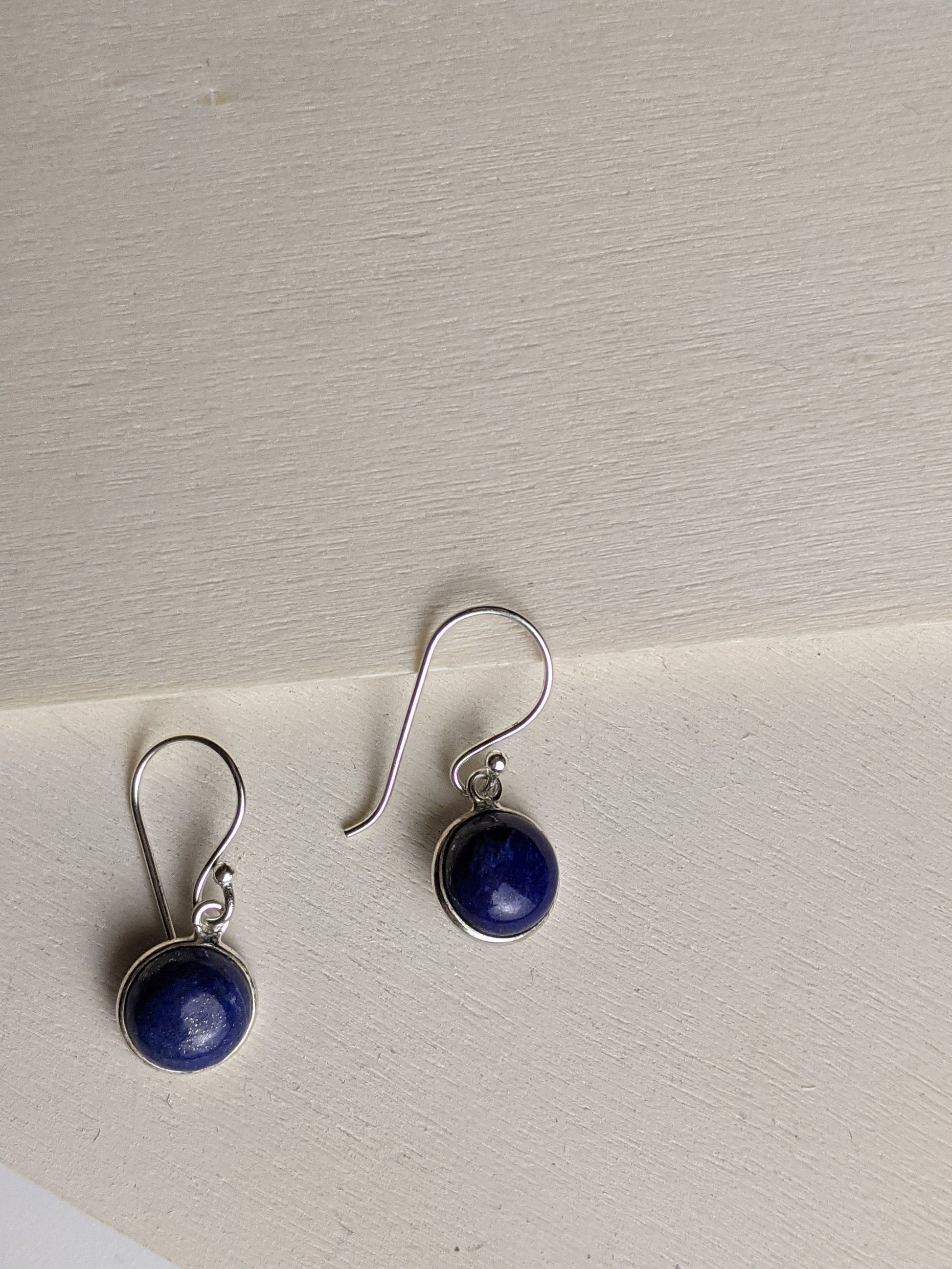 This classic round drop earring is a staple. Lapis Lazuli is a strong deep navy with little flecks of fold that make a subtle statement. Set In Sterling Silver .925.